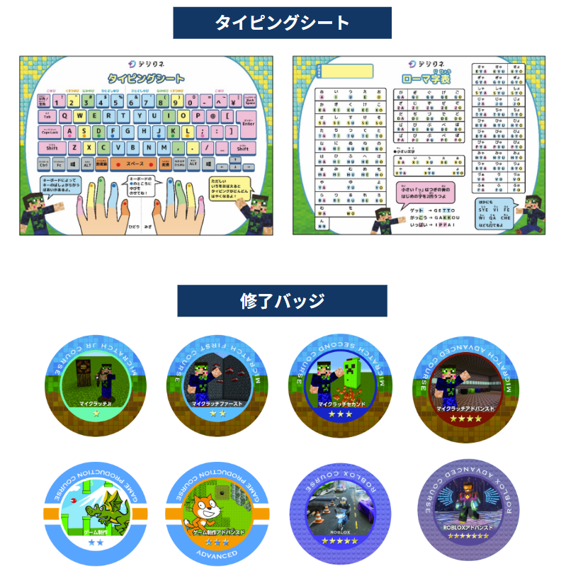 授業は「タイピングシート・修了バッジ・コース修了証書」
