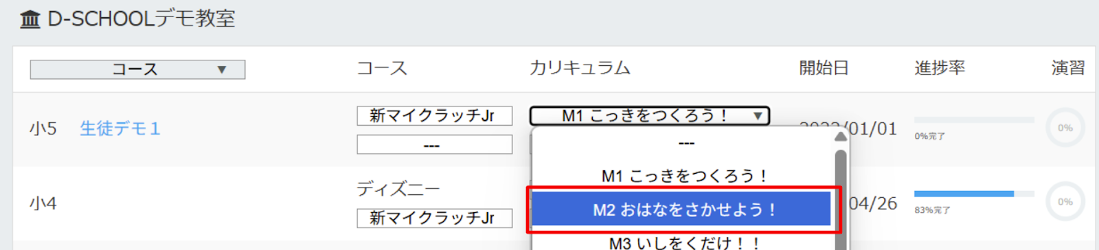 →管理画面>生徒一覧>該当生徒「カリキュラム」で解放したいミッションを選択