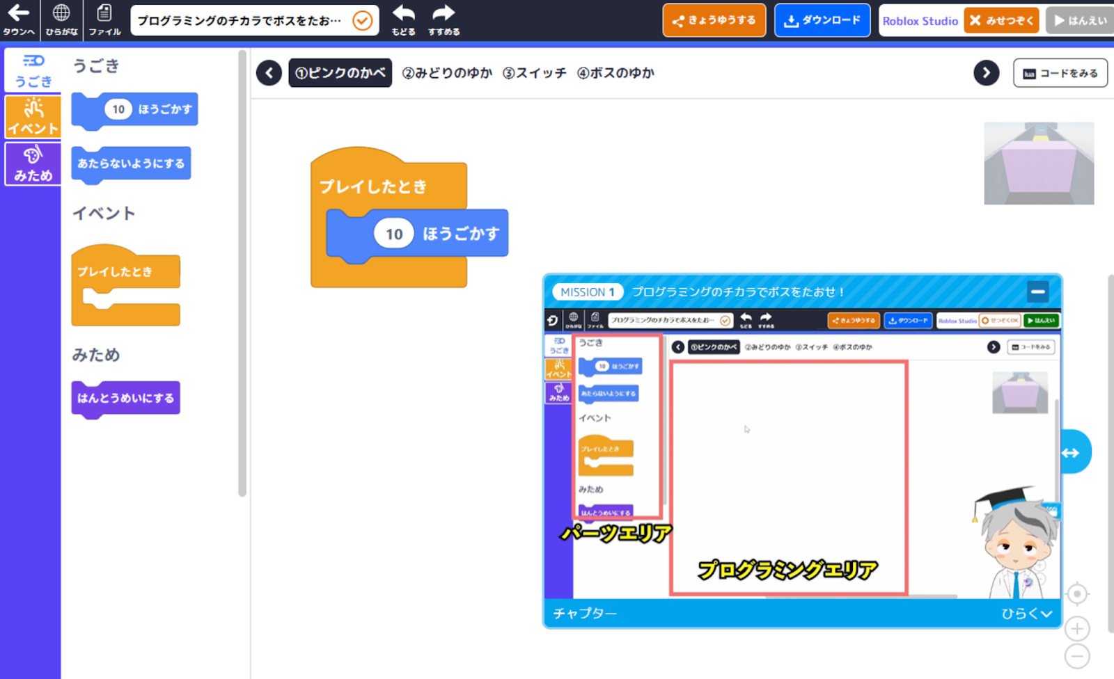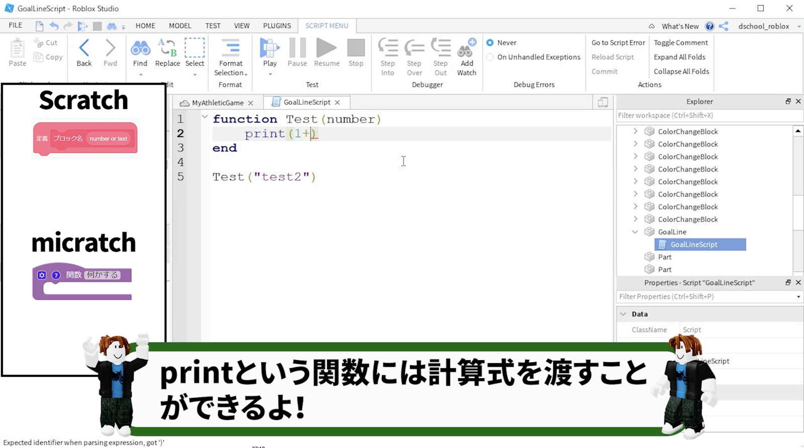 世界中で爆発的にユーザー数が増えているRobloxを活用したテキストプログラミングのコースです。 3Dゲームを作りながら学習することで、高度なプログラミングが楽しく身につく日本初のRobloxでプログラミングが学べるコースです。