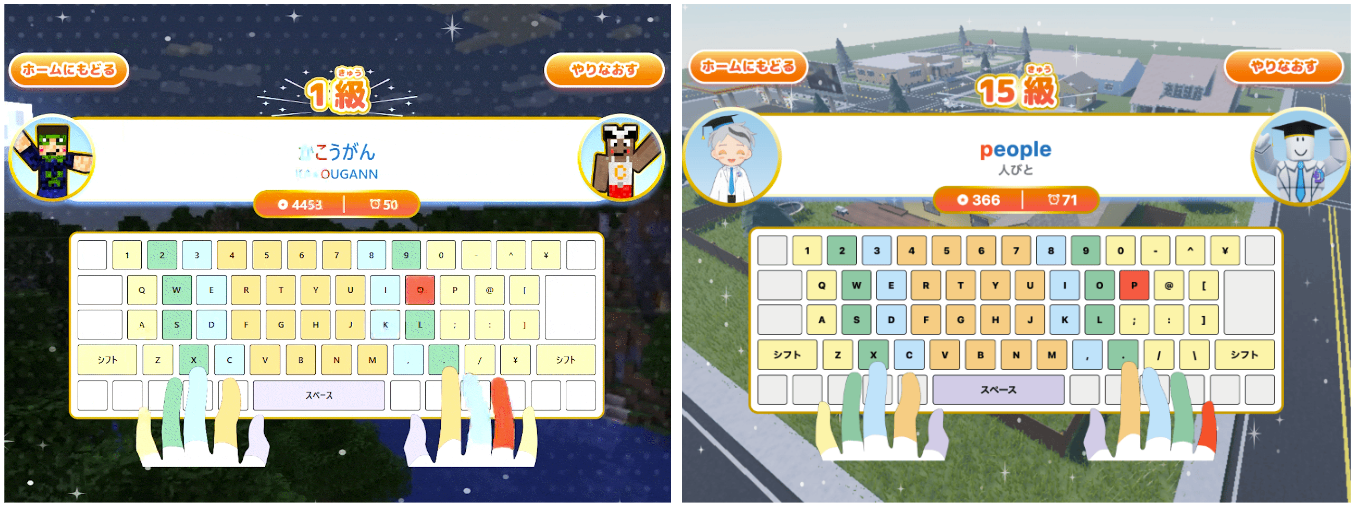 タイムアタック形式で自分の記録に挑戦したり、アバター先生と一緒に楽しく練習を進めたりできます。