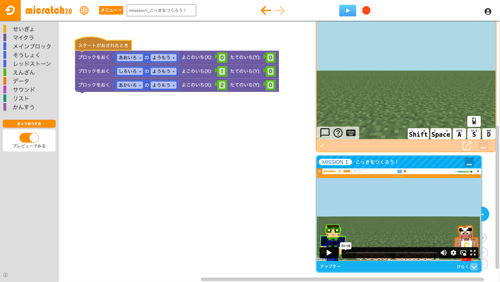 プログラムを組み、青色の実行ボタンを押すと、プログラムの内容がマインクラフトJava版(またはプレビュー画面)に反映されます。