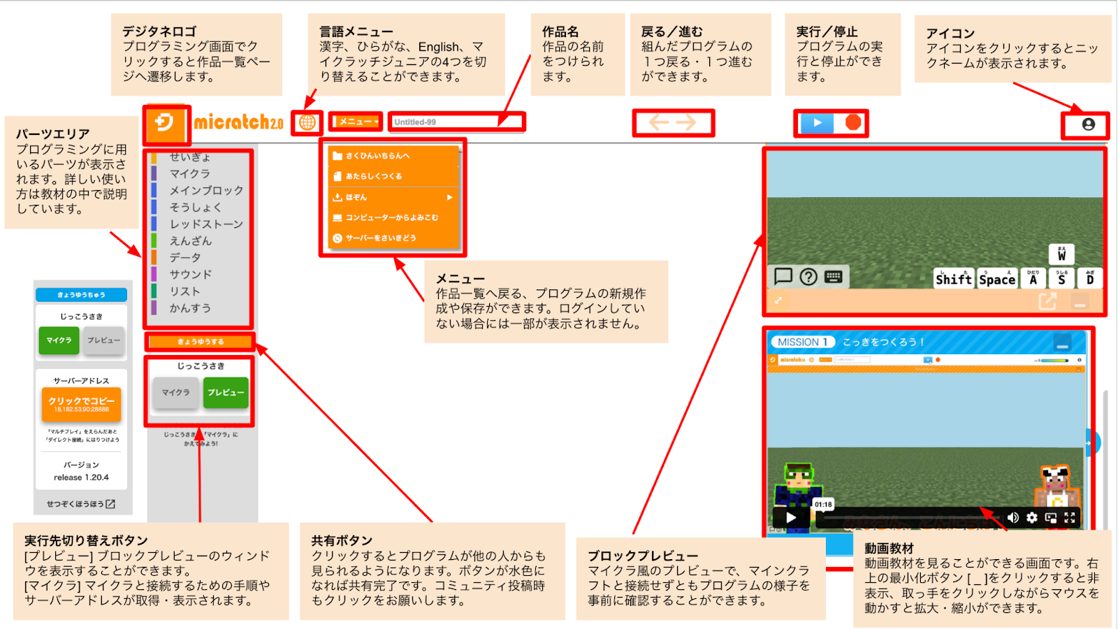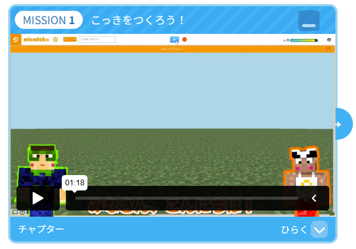 上述の学習ページの「マイクラッチ(プログラミング制作ページ)はこちら」から起動した場合、マイクラッチ2.0上に学習ページの動画教材が表示されます。