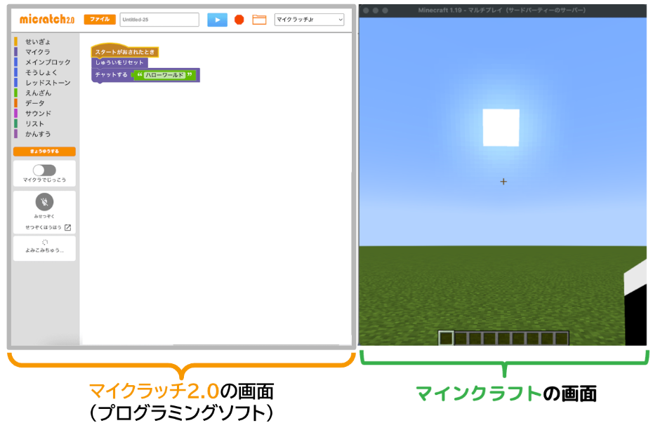 また、マインクラフトJava版と接続して授業を行う場合は、必ず2画面両方が見える状態で実行してください。Google Chromeの仕様によって、ウィンドウが重なり隠れてしまうと動作しない恐れがあります。