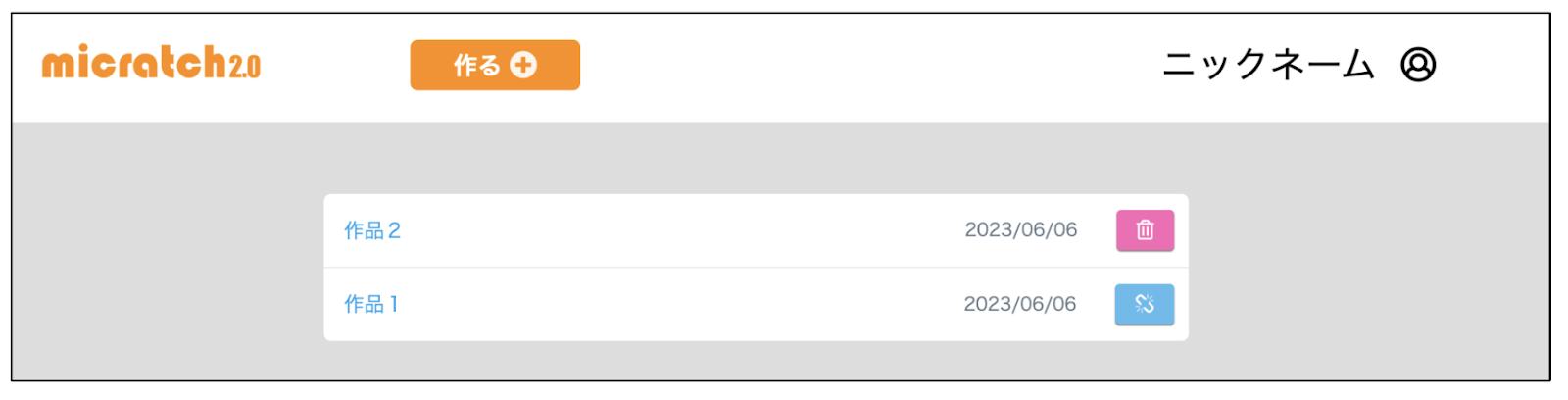「 私の作品」ページには、作ったプログラムが⾃動で保存されていきます。