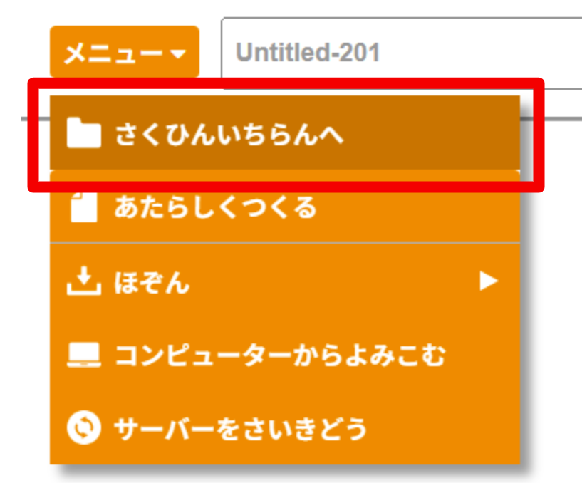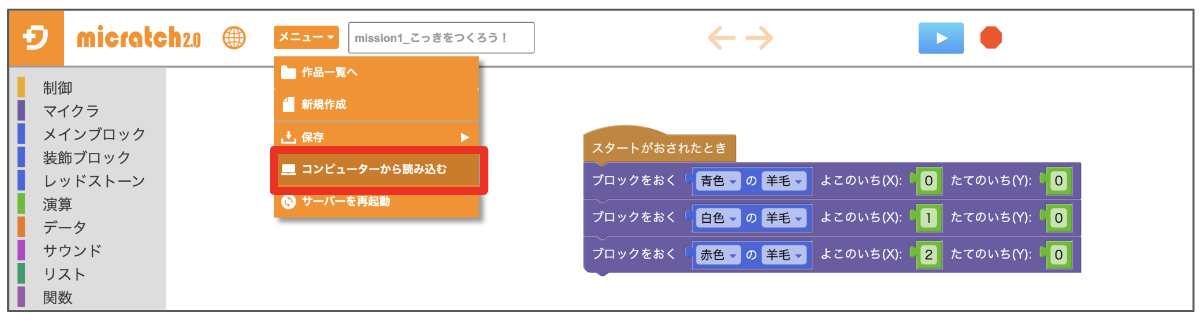 パソコンに保存した作品やサンプルプログラムを開く場合、上部のメニューより「コンピューターから読み込む」を選択いただき、 .mc2 の拡張子ファイルを読み込ませていただくことで、プログラムファイルが読み込まれます。