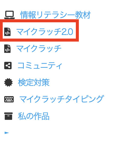 学習ページの「動画を見る」から「マイクラッチ(プログラミング制作ページ)はこちら」、または左メニューの「マイクラッチ2.0」をクリックしましょう。